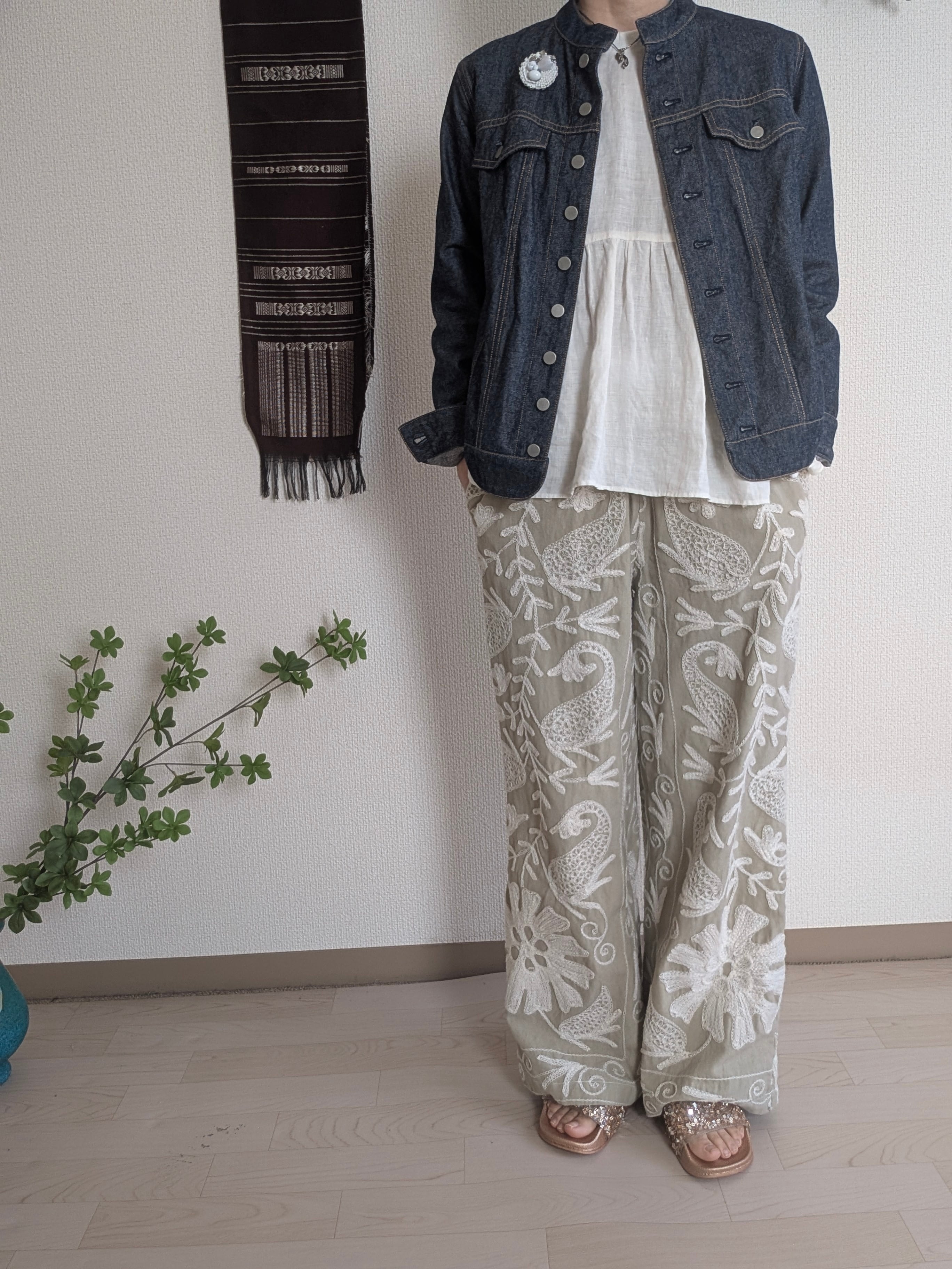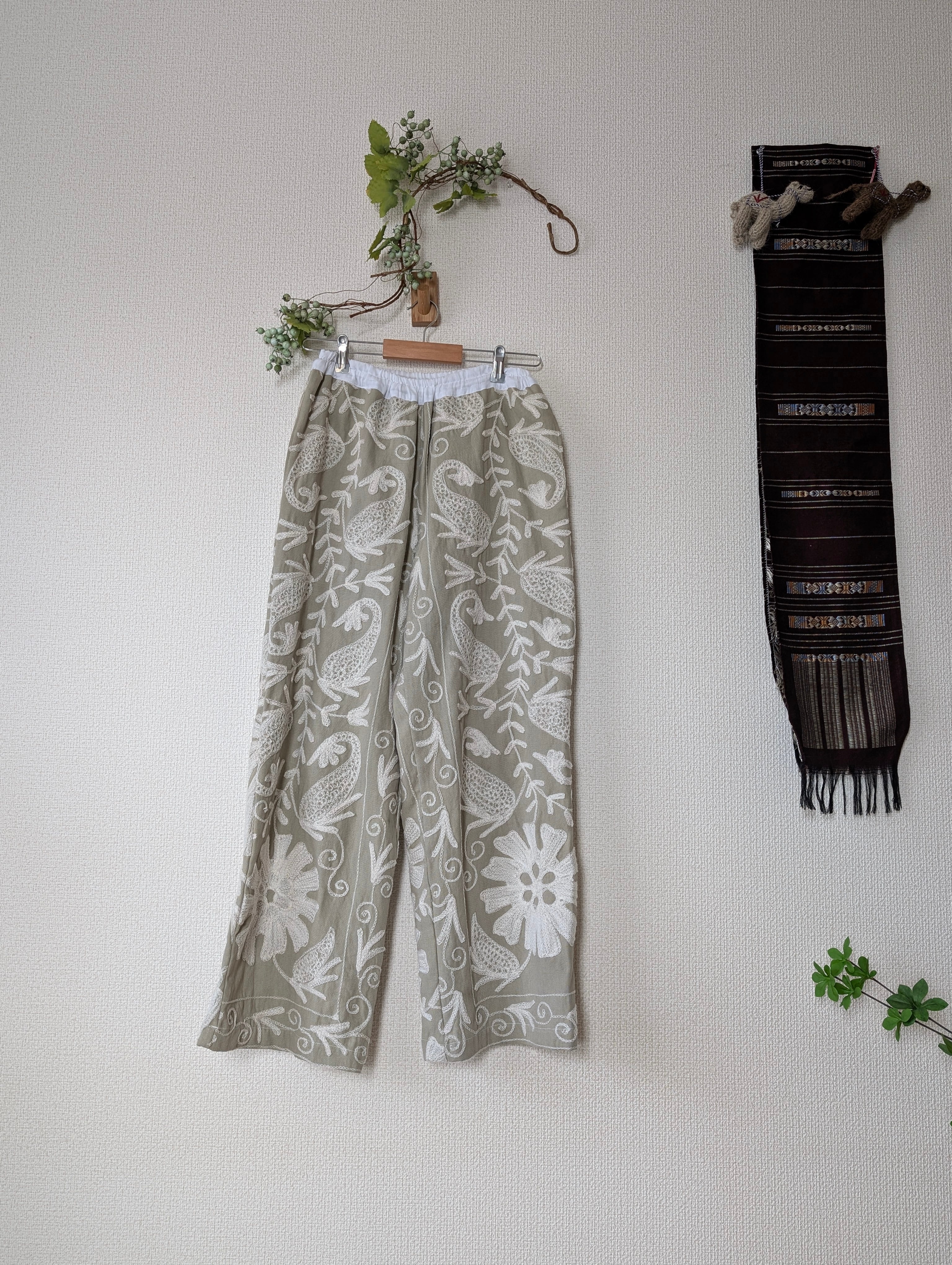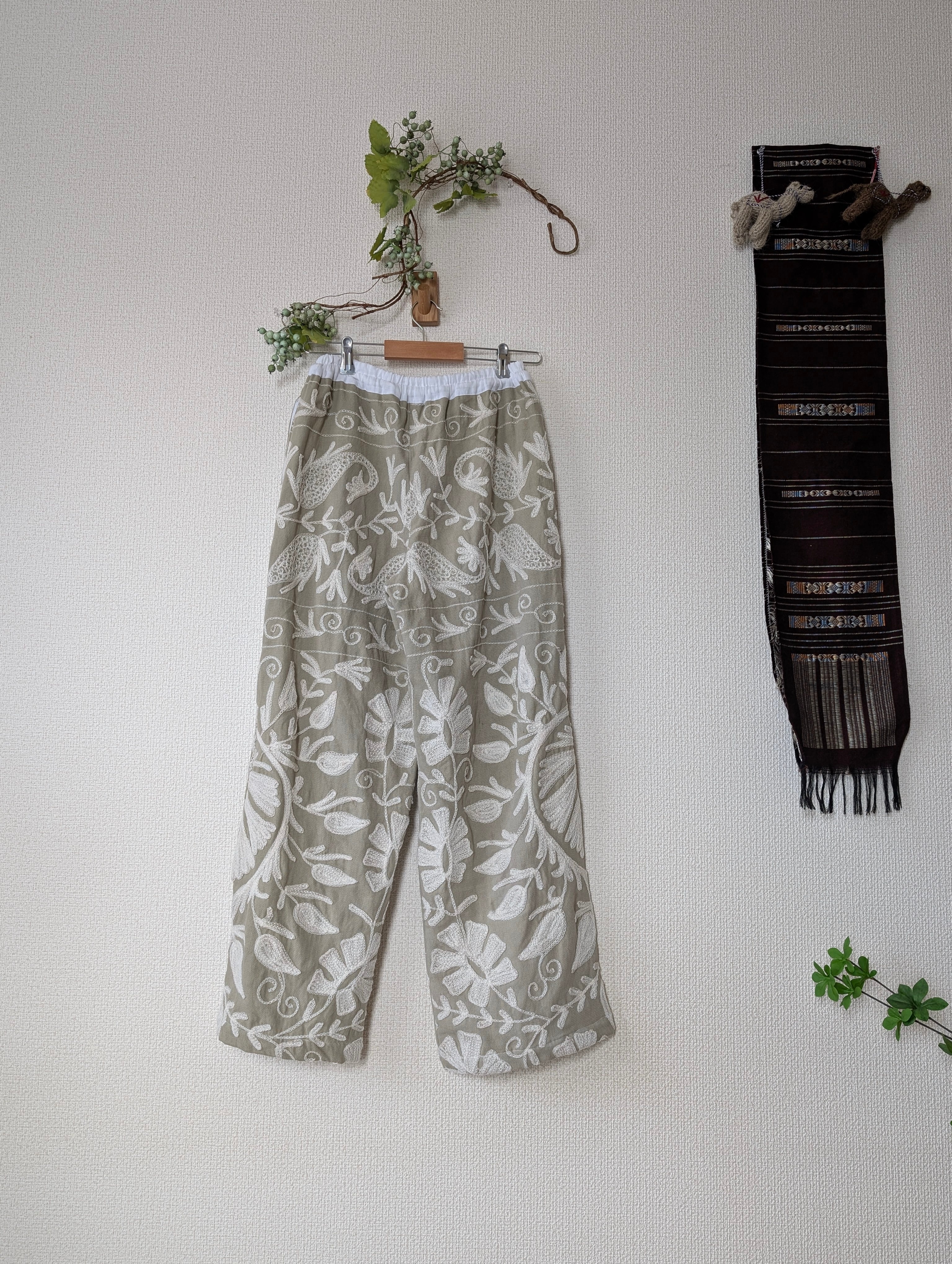 即納【スザニパンツストレート】薄カーキベースにホワイト刺繍