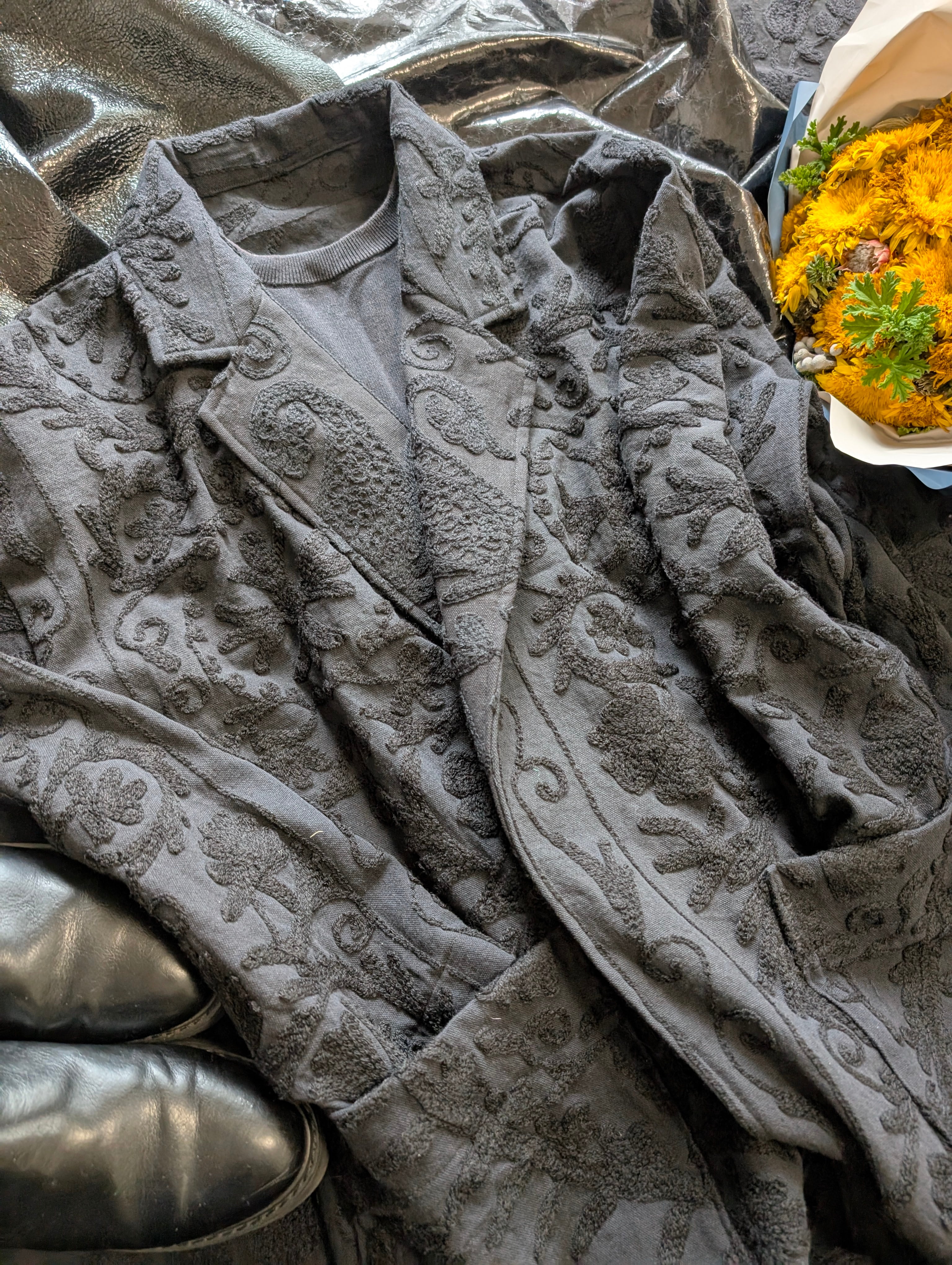 黒い生地に浮かぶ美しくふくよかな刺繍が、