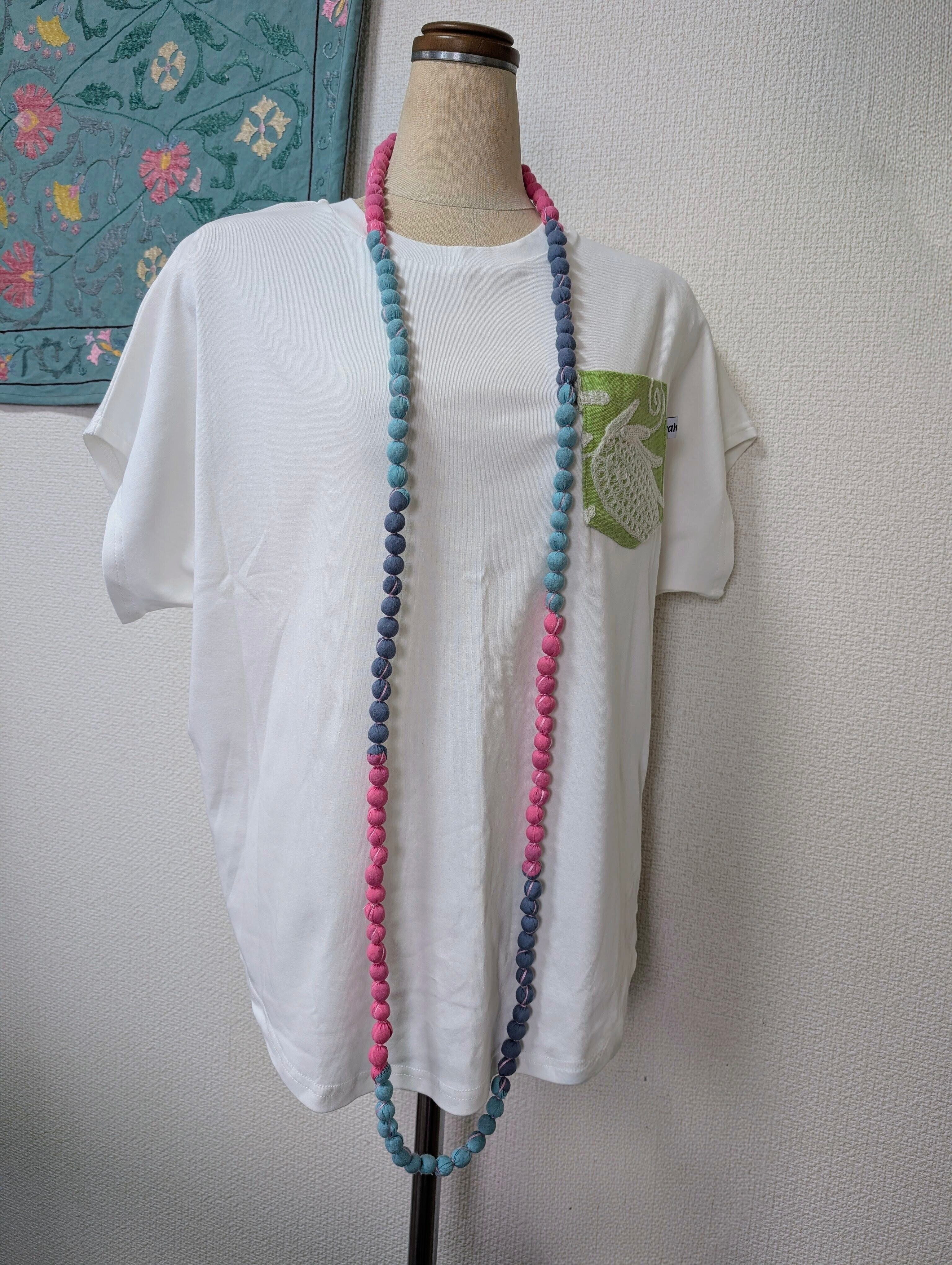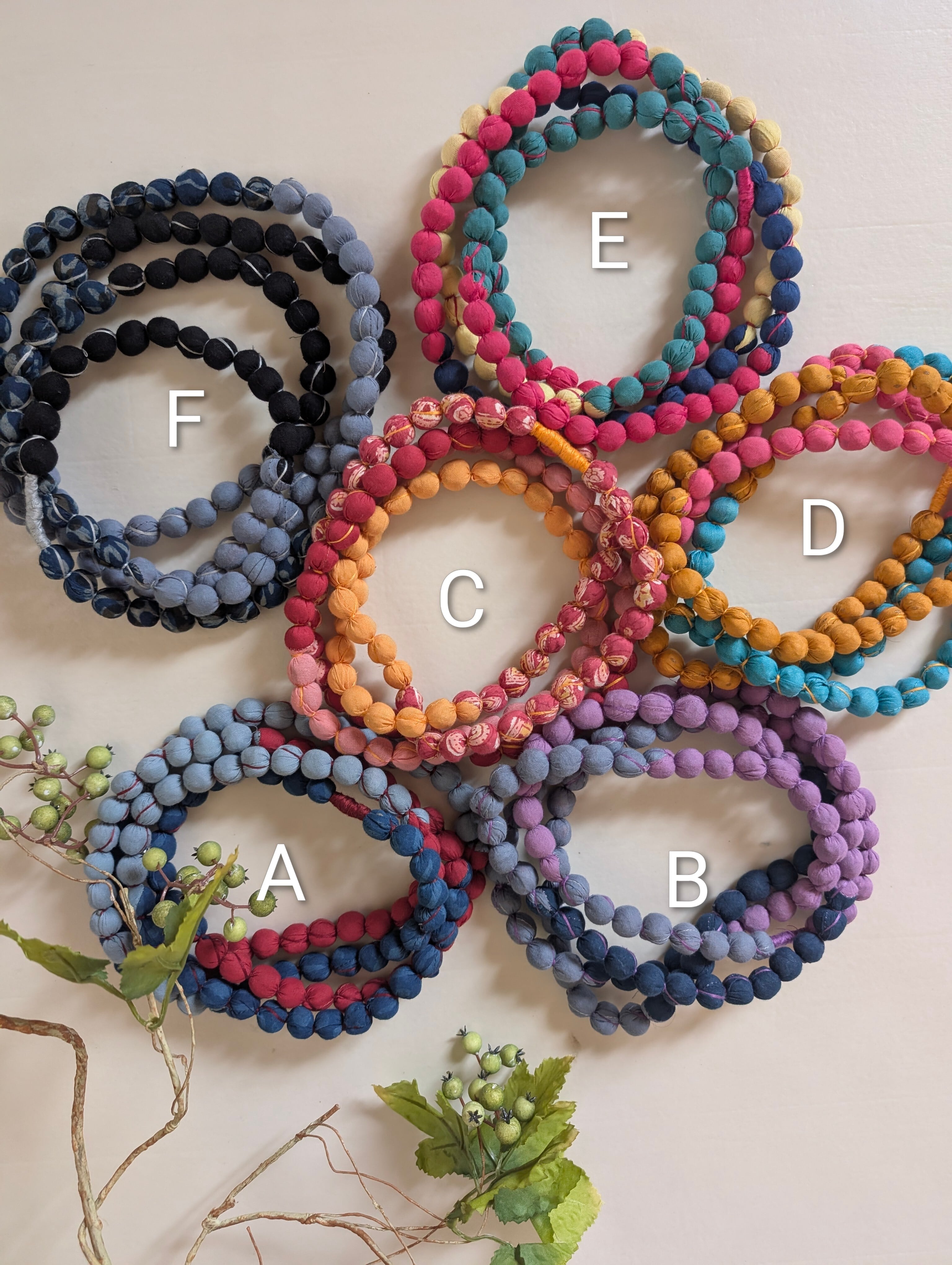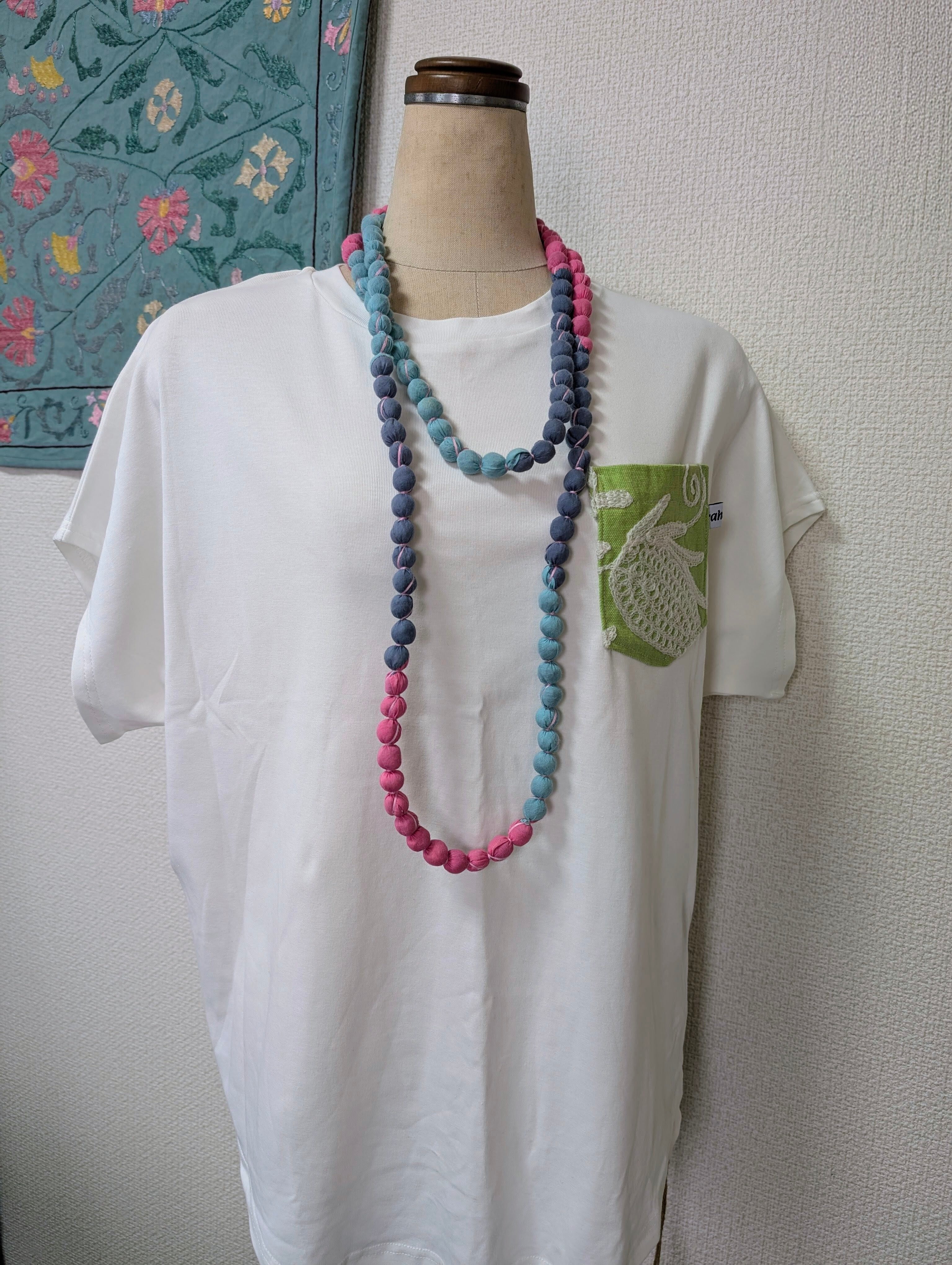 このネックレスは、カラフルなブロックプリントで綿の小さなボールをくるんであり、