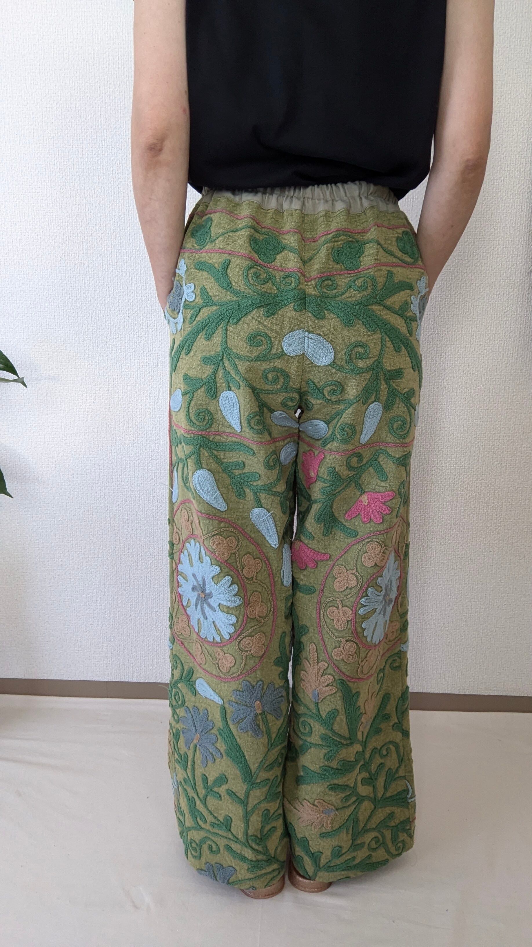 グリーンの染めがおしゃれな総刺繍スザニストレートパンツ。